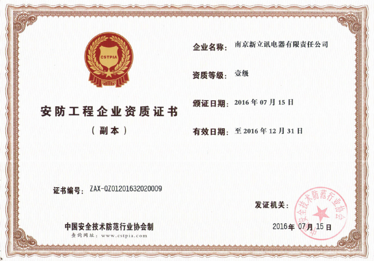 2015年7月,新立訊榮獲中國安全技術防范行業協會頒發的安防工程企業一級資質證書,證書編號ZAX-QZ01201632020009,這不僅是公司在安防領域技術實力的體現,同時獲得該證書也將進一步提升公司的知名度和影響力,增強公司的綜合競爭能力,為今后在安全技術防范領域業務市場的拓展奠定堅實基礎。