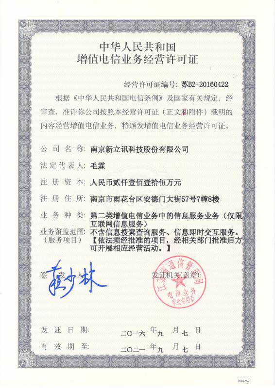 新立訊喜獲由江蘇省通信管理局頒發(fā)的《中華人民共和國增值電信業(yè)務(wù)經(jīng)營許可證》,這對于企業(yè)發(fā)展可謂是注入了一劑強(qiáng)心劑。