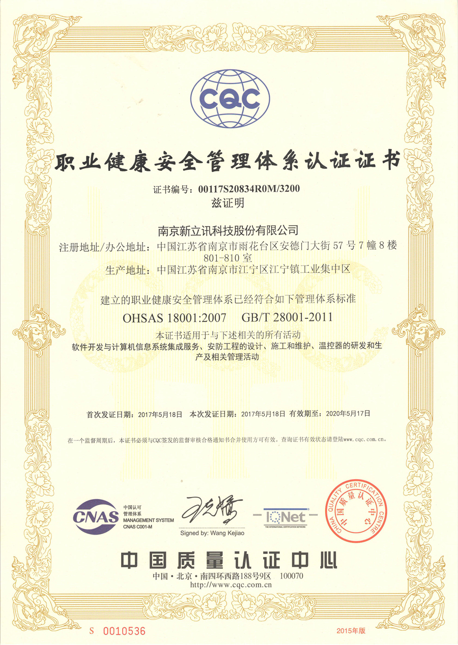 2017年5月,新立訊經(jīng)中國(guó)權(quán)威認(rèn)證機(jī)構(gòu)CQC(中國(guó)質(zhì)量認(rèn)證中心)全面、嚴(yán)格的評(píng)定與審核,正式通過(guò)ISO9001國(guó)際質(zhì)量管理體系認(rèn)證、ISO14001國(guó)際環(huán)境管理體系認(rèn)證、OHSAS18001職業(yè)健康安全管理體系認(rèn)證三大國(guó)際管理體系認(rèn)證,并獲得相關(guān)證書(shū)。證書(shū)涵蓋范圍包括軟件開(kāi)發(fā)與計(jì)算機(jī)信息系統(tǒng)集成服務(wù),安防工程的設(shè)計(jì)、施工和維護(hù),溫控器的研發(fā)和生產(chǎn)及相關(guān)管理活動(dòng)。這意味著新立訊成為CNAS(中國(guó)合格評(píng)定國(guó)家認(rèn)可委員會(huì))、IQNet(國(guó)際認(rèn)證聯(lián)盟)和IAF(國(guó)際認(rèn)可論壇)三方共同認(rèn)可的綜合數(shù)據(jù)應(yīng)用服務(wù)商,更標(biāo)志著新立訊的質(zhì)量管理、環(huán)境管理、健康安全管理等已達(dá)到國(guó)際先進(jìn)水平。同時(shí)此三項(xiàng)證書(shū)的取得是對(duì)新立訊企業(yè)管理理念和質(zhì)量管理水平的充分肯定,也為企業(yè)向社會(huì)提供優(yōu)質(zhì)的產(chǎn)品和服務(wù)提供了強(qiáng)有力的保障。