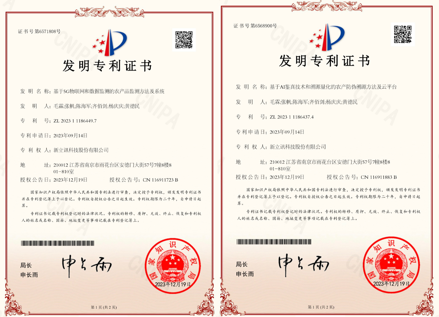 2023年12月,新立訊在農(nóng)產(chǎn)數(shù)據(jù)交易領(lǐng)域再獲4項發(fā)明專利。發(fā)明專利涵蓋了農(nóng)產(chǎn)數(shù)據(jù)交易與防偽鑒真多個方面,包括數(shù)據(jù)采集、處理、分析和應(yīng)用等,將有效提高農(nóng)產(chǎn)交易數(shù)據(jù)效率和可持續(xù)性。